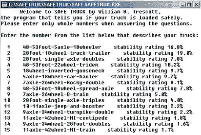 Safe Truck for Windows (right) is a command line program designed to be easy to use—just follow the simple step by step instructions on the screen. However, this beta version only allows integer numbers at the present time, so it is less precise than the Pocket PC version, and as with all command line programs, prone to hang if incorrect data is entered. It will eventually be integrated into truck weigh station computers to give weigh masters an instant method of determining if a truck is loaded safely.