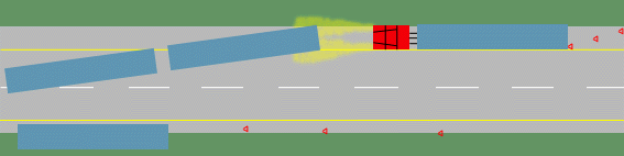 Because crash absorbent rear bumpers and under ride protection is illegal in the United States, the trucks that block the road will need to be parked at an angle beginning on the shoulder and angling toward the center. There must be a lane open for cars to pass through. In order to prevent collision damage to tractors, trailers should be dropped. At night a truck should be parked behind the roadblock to illuminate it with headlights. Reflective triangles should be arrayed in a legal fashion (the diagram is not to scale). A third trailer should be parked on the opposite side of the road from the angled trailers so that at their narrowest point they are 11 feet apart. This will allow plenty of room for cars and smaller trucks to go through, but stop big trucks—which would lose their mirrors if they tried going through at speed. There should be only inches to spare on either side of the mirrors when a truck tries to go through. When the truck slows down, a picket sign tilted in front of it will persuade the driver inside to stop. Protesters can then climb up and talk to the driver and direct him where to park. It would be polite to offer him coffee. Trucks should be parked in front of the roadblock in triple file line (or 4 or 5 lines if it is a 3 or 4 lane highway) and the protest meeting should take place in the grassy median.